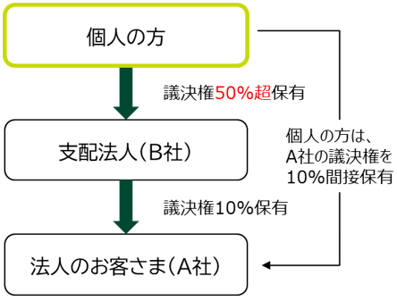 - ✓個人の方は、支配法人B社(個人の方はB社の議決権を50%超保有)を通じて法人のお客さま(A社)の議決権を10%間接保有しています。