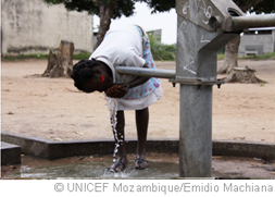 写真:手押しポンプ式井戸で手を洗い、水を飲むデルフィナ(ブジ地区)