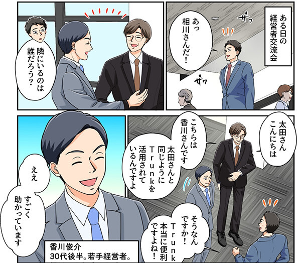 念願の会社を立ち上げた太田。法人口座選びに頭を悩ませていたところ、経営者相川さんとの出会いで「Trunk」の存在を知ることに…