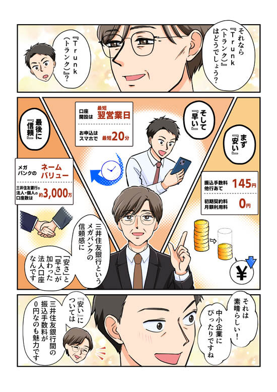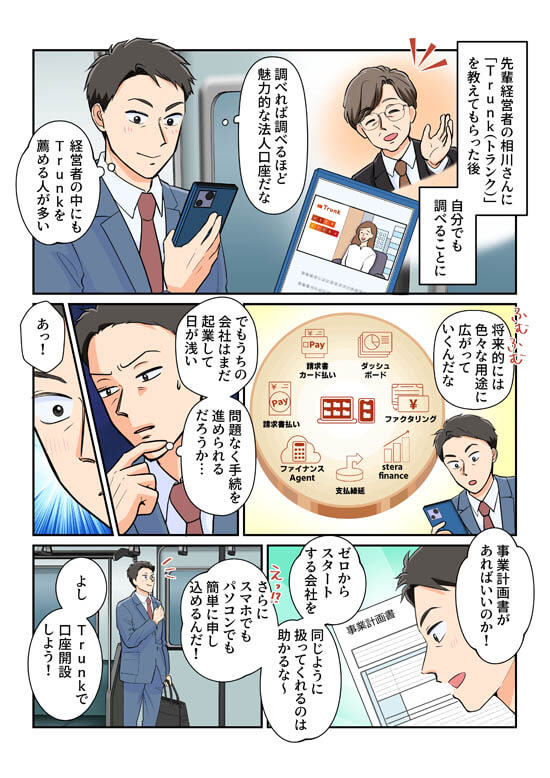 念願の会社を立ち上げた太田。法人口座選びに頭を悩ませていたところ、経営者相川さんとの出会いで「Trunk」の存在を知ることに…