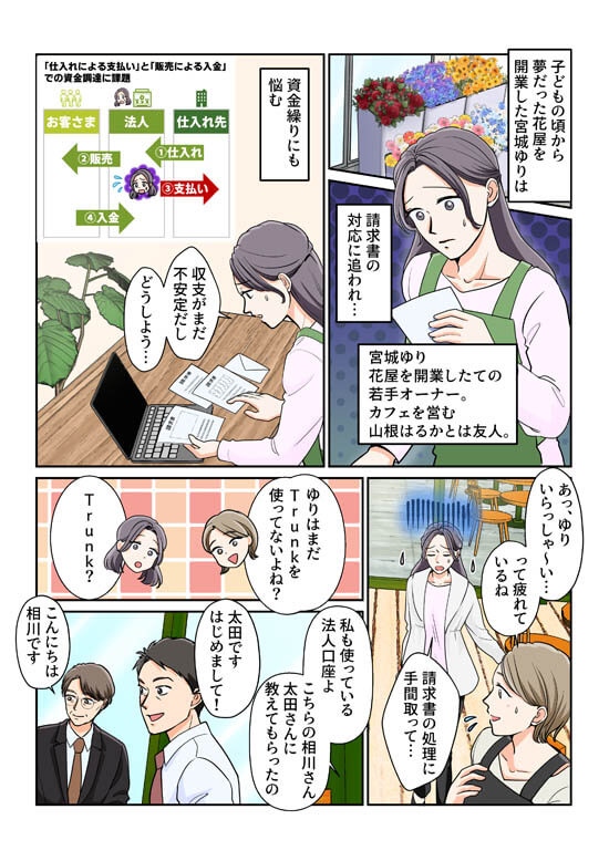 夢だった花屋を開業した宮城。請求書対応に追われ、資金繰りに悩む日々。そんな時、「Trunk」の請求書支払機能と出会い…