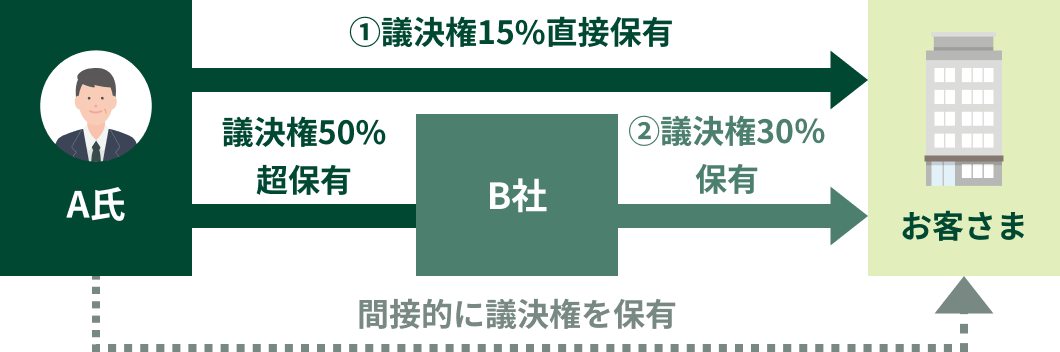 • ※1議決権を『間接に保有する』とは、「議決権の50%超を保有する支配法人」を通じて、法人のお客さまの議決権を保有することをいいます。一例を下図に示します。