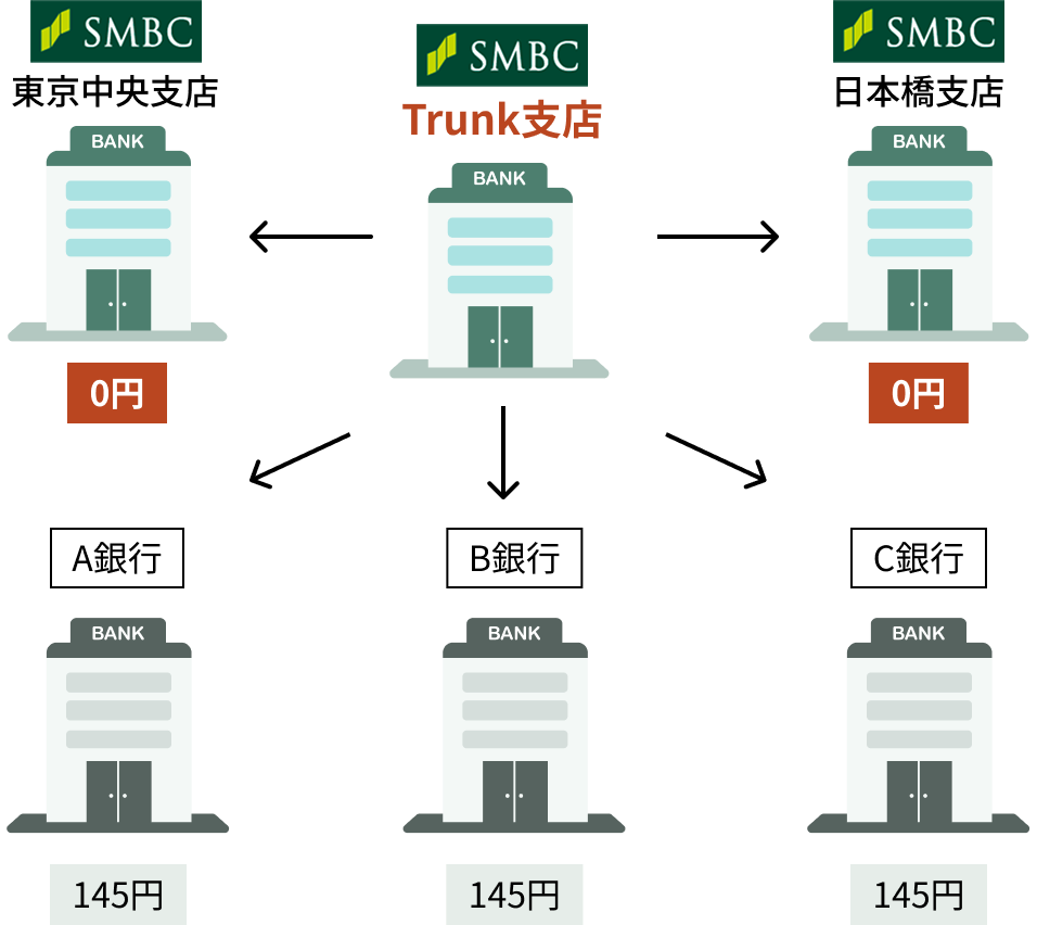 (他行宛145円×60件 + 三井住友銀行宛0円×40件)÷ 100件 = 87円/件