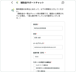 画面右下の「補助金用チャット」ボタンを押すと立ち上がるチャットに必要事項を入力します。