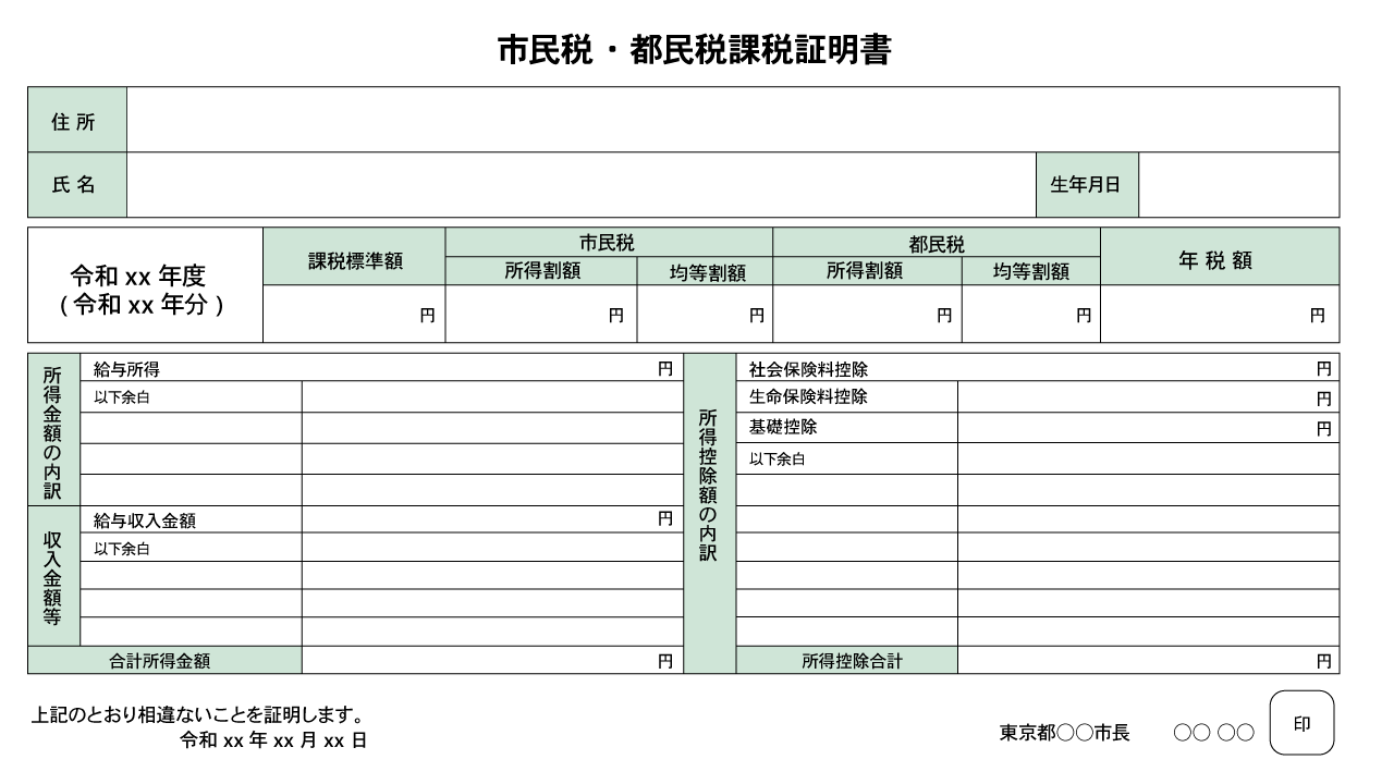 所得証明書は、前年の所得金額を証明する書類です。課税証明書には、所得だけでなく、所得控除の内容や住民税額も記載されています。