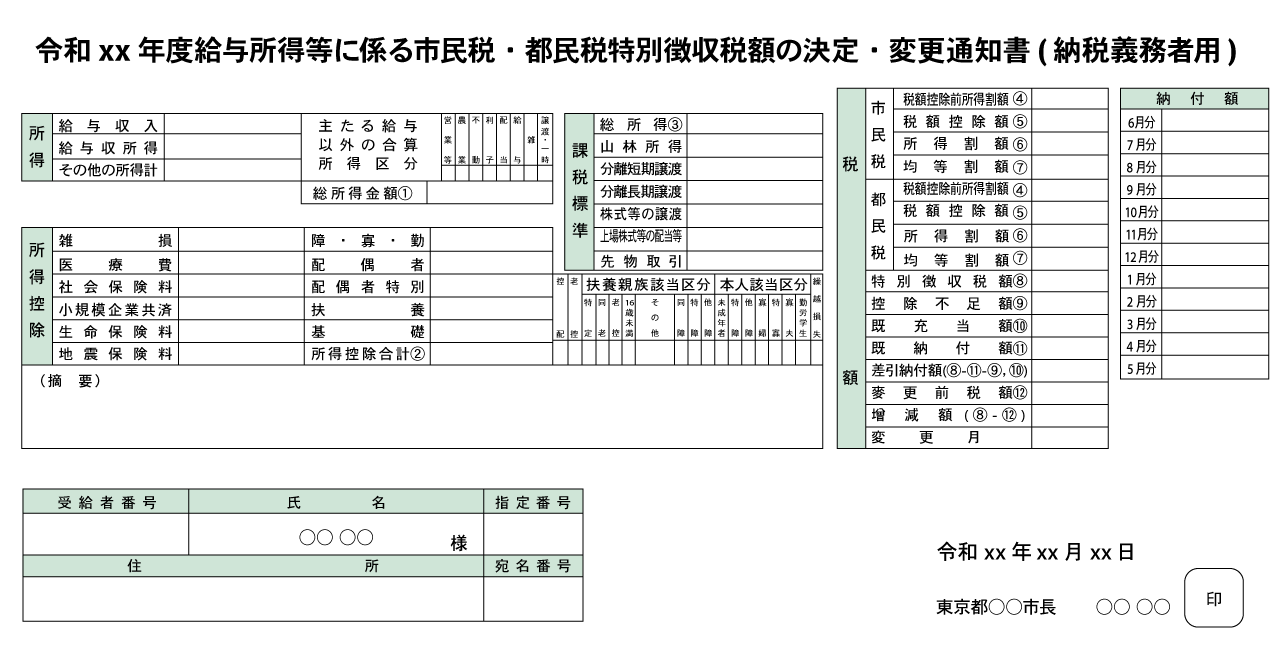 納税通知書(住民税決定通知書)は、住民税の金額や所得、控除内容を通知する書類です。毎年6月頃に市区町村から発行されます。