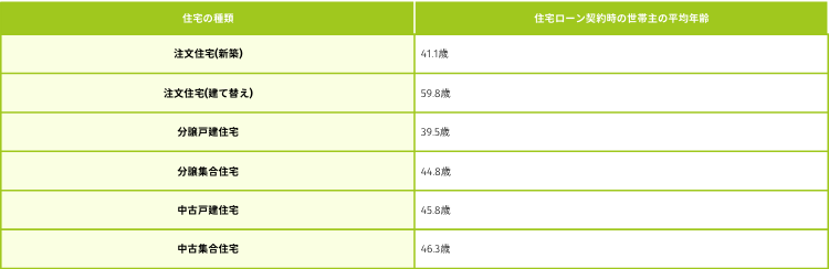 下表は、住宅の種類ごとのローン契約時における世帯主の平均年齢(一次取得・二次取得の合計)をまとめたものです。