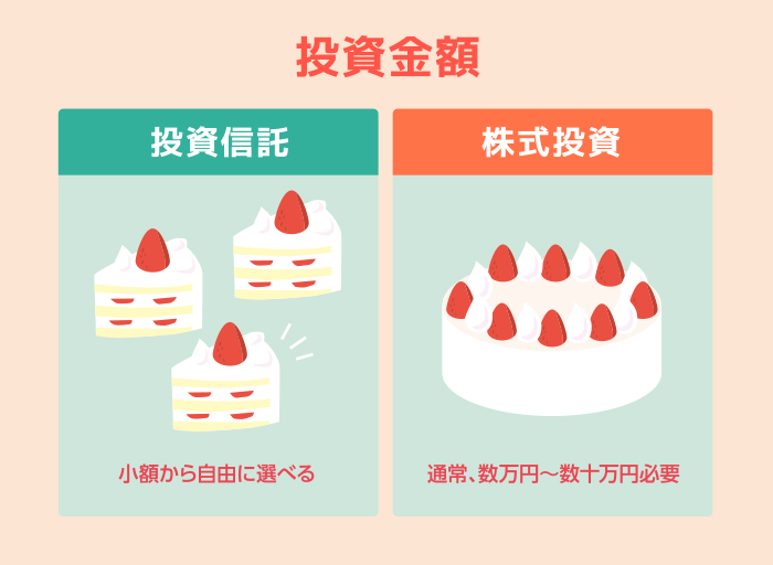最後に、金額の違いを解説します。投資信託は、少額から自由に金額を選べるのに対して、株式投資は、通常数万円〜数十万円程度必要になります。ケーキに例えるなら、ひと切れから買えるのが投資信託。ホールケーキからしか買えないのが株式投資といえそうですね。