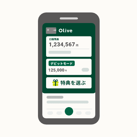 - ※特典は、月初3営業日の翌日〜月末までに三井住友銀行アプリから選択が可能、月末時点で選択している特典を翌月に提供します(特典選択後も、月内であれば翌月に適用する特典を何度でも選び直し可能)。なお、Oliveアカウント申込当月については、前月に特典選択ができないため、一律で「コンビニATM手数料無料」(2個選択)を適用いたします。