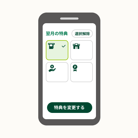 - ※選べる特典は一度選択したものが翌月以降も自動選択されます。変更する場合はアプリ画面から再度選択する必要があります。