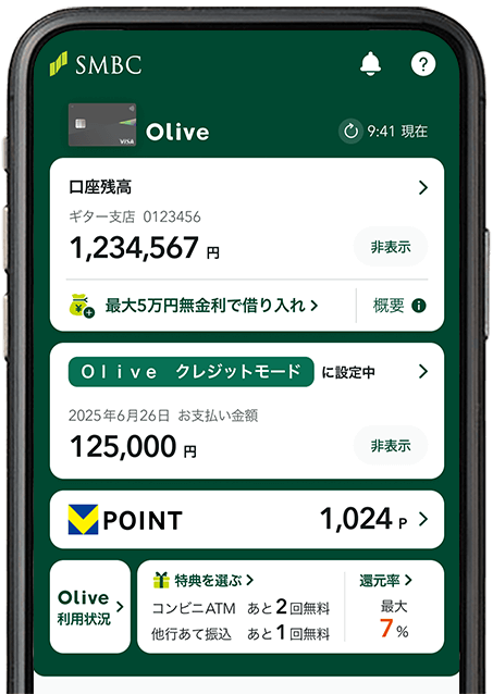 - Oliveフレキシブルペイは、当行と三井住友カード(株)が共同で提供するサービスです。両社が、お客さまとの取引に関する情報を、相互に提供、受領、共有、使用することについて、お客さまに同意いただく必要があります。カード発行会社は三井住友カード(株)です。