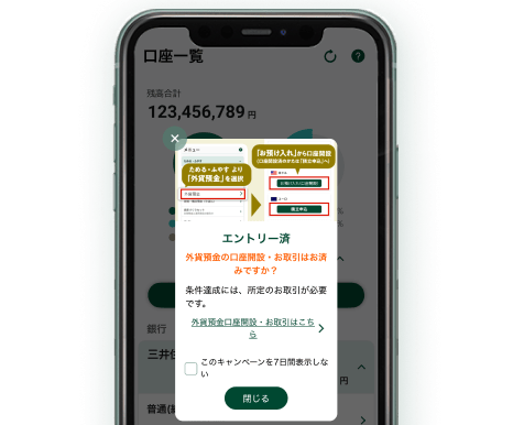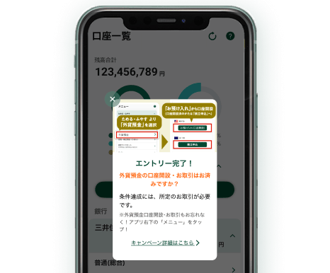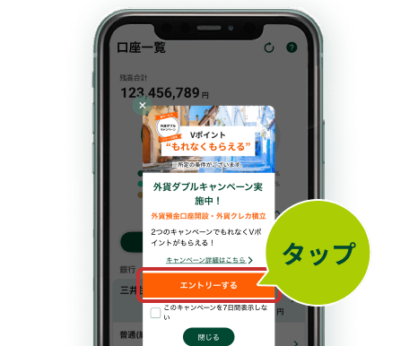 三井住友銀行アプリの「口座一覧」画面右側に表示される本キャンペーンバナーをタップ。