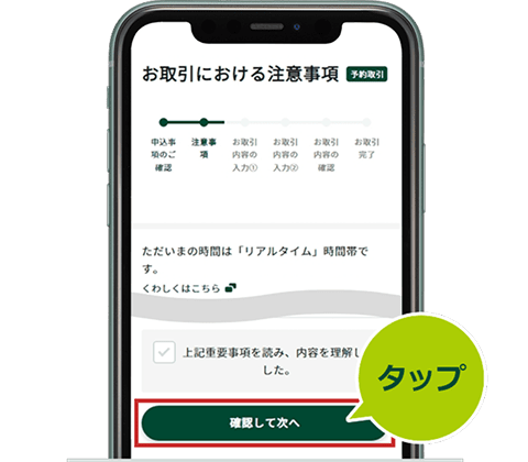 お取引における注意事項を確認し、「確認して次へ」をタップ。