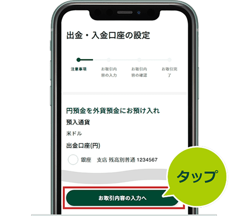 出金、入金口座情報を入力し、「お取引内容の入力へ」をタップ。