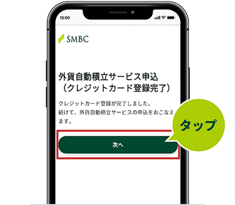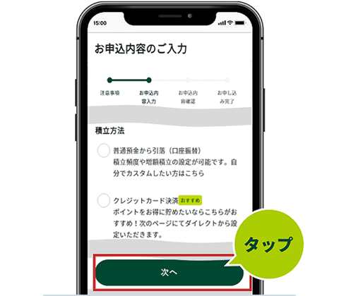 積立方法で「クレジットカード決済」を選択し、積立金額を入力後、「次へ」をタップ。