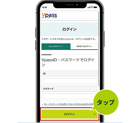 VpassID・パスワードを入力し、「ログイン」をタップ。