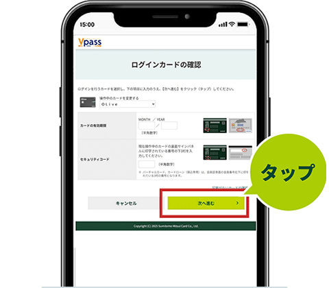 対象のカードを選択し、有効期限・セキュリティコードを入力後、「次へ進む」をタップ。