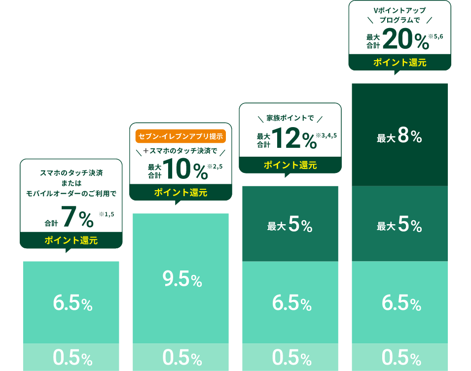 - ※3 「最大10%」は、「対象のコンビニ・飲食店で最大7%還元」に加えて、3%が付与された合計還元率です。「3%」のうち0.5%は、お支払い時のセブン-イレブン・アプリの会員コード提示によって付与されたセブンマイルです。セブンマイルはVポイントに交換できます。