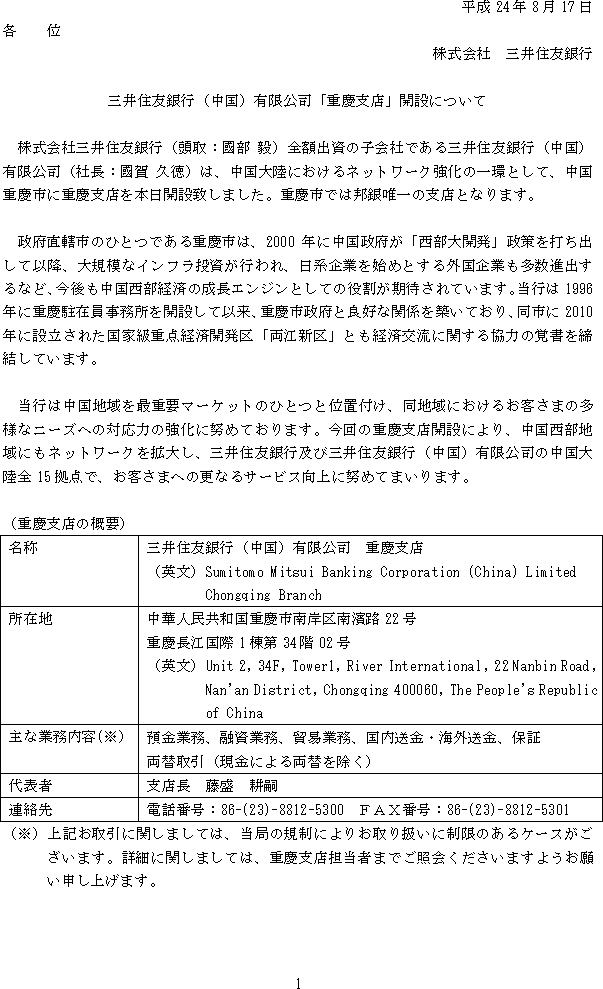 三井住友銀行(中国)有限公司「重慶支店」開設について(1/2)