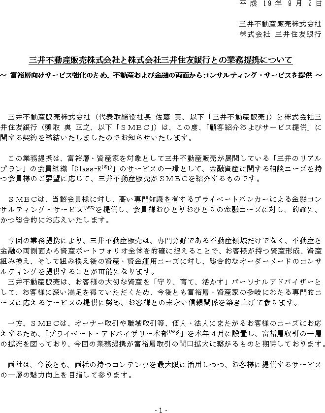三井不動産販売株式会社と株式会社三井住友銀行との業務提携について(1/3)