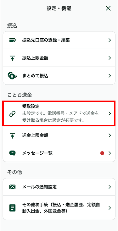 連絡先(携帯電話番号・メールアドレス)でことら送金を受け取りたい場合は、事前に口座番号と紐づける「受取設定」が必要です。