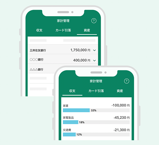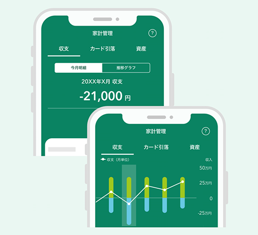 家計管理画面では、月々の収入や支出、クレジットカードの引落金額等をまとめて管理することが可能です。