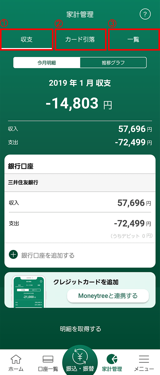 Moneytreeと連携することで、その他金融機関やクレジットカード情報も一覧で確認できます。 - ②カード引落画面