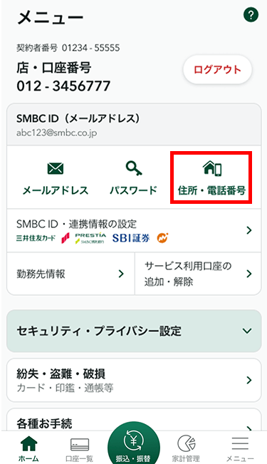 ご登録の住所・電話番号の変更が可能です。三井住友カード(Vpass)のアカウントが連携されたSMBC IDをご利用の場合、「住所」と、ひとつめの「電話番号」が三井住友カードに反映されます。また、変更のお手続には、事前のSMBCセーフティパスの登録またはワンタイムパスワードの入力が必要です。ワンタイムパスワード有効化手続きについてはこちら