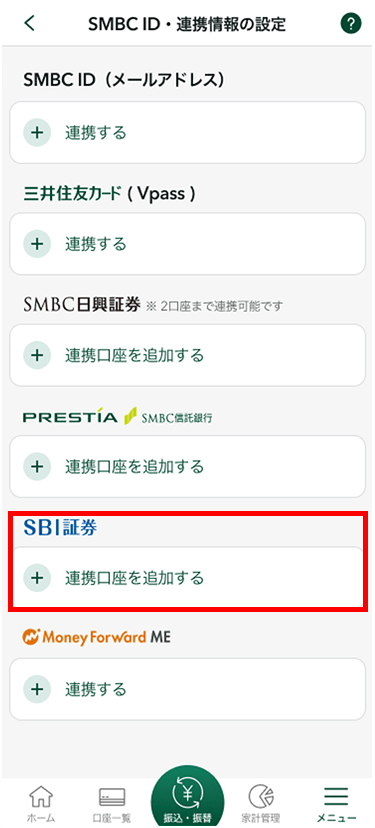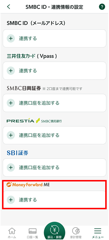SMBC IDと三井住友カード(Vpass)を連携することができます。また、本アプリとSMBC日興証券口座、SBI証券口座、マネーフォワード MEと連携することができます。
