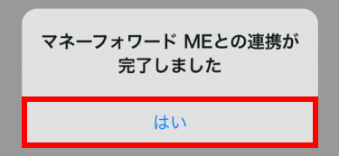 - 6マネーフォワード MEでの操作後、自動的に三井住友銀行アプリに戻ります。連携完了のポップアップが表示されますので「はい」をタップしてください。