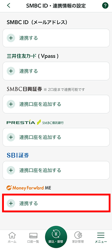 マネーフォワード MEとの連携には、SMBC IDの登録が必要です。SMBC IDに三井住友銀行アプリと三井住友カードのVpass IDを紐づけている場合、マネーフォワード MEの連携状態はVpassアプリにも反映されます。