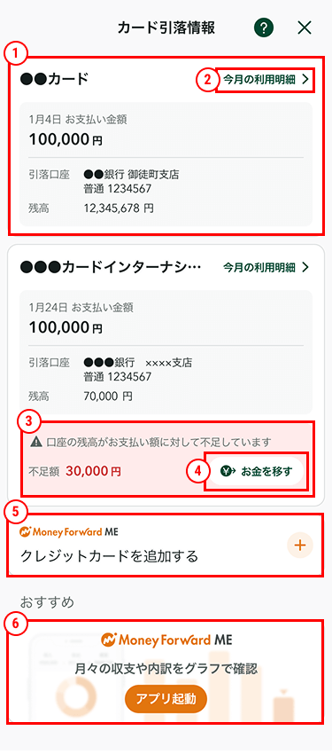 - 5マネーフォワード MEに移動して、クレジットカードや引落口座の登録ができます。