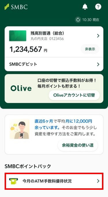 Oliveアカウント申込済の場合は、口座残高下のエリアにATM手数料優待状況が表示されます。