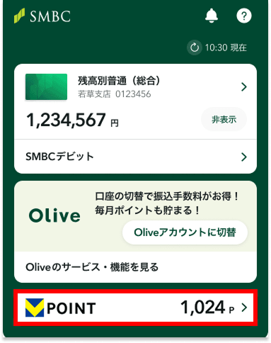 この画面で表示されるポイント数は、本アプリにログインしたSMBCダイレクトご利用の口座におけるポイント数と、本アプリに連携されているVpassIDにおけるポイント数との合算数と異なる場合がございます。