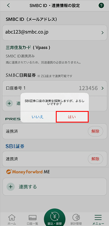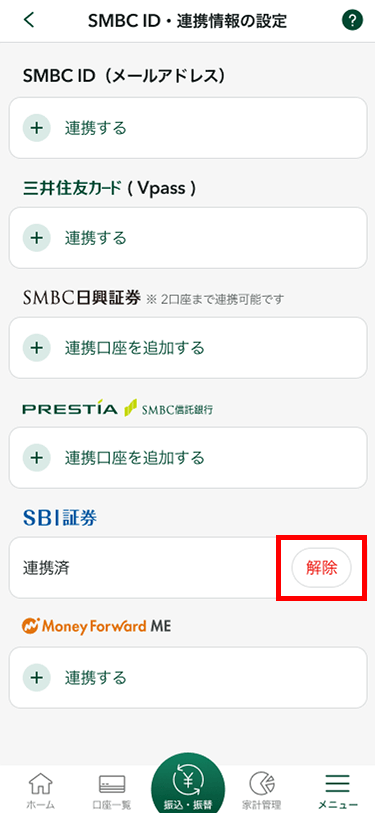 - 1.「SMBC ID・連携情報の設定」より、SBI証券欄の「解除」をタップします。